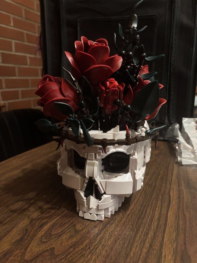 Inside the box, you’ll find over 1079 precision cut pieces, each one crafted to bring the GothBrix Skull Rose Build to life. From the intricately layered deep red roses to the vine-wrapped crown of thorns, this isn’t just a building kit, it’s an experience.